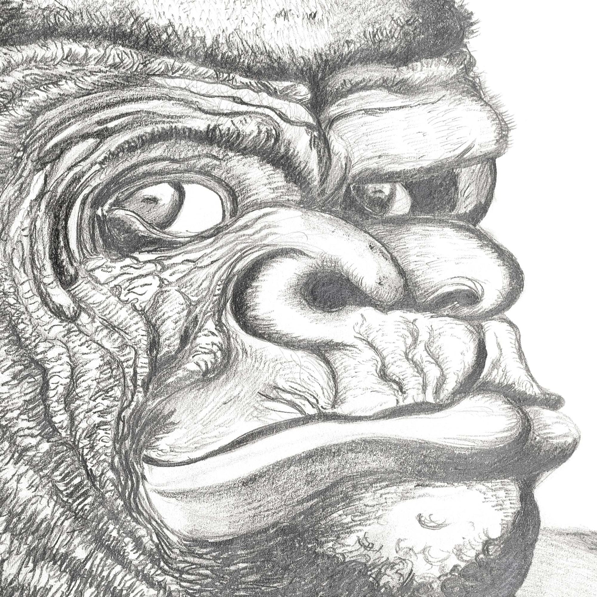 A finely detailed pencil drawing of a gorilla presented with a playful, comical twist, paying homage to Stanisław Szukalski’s Portrait of a Gorilla.