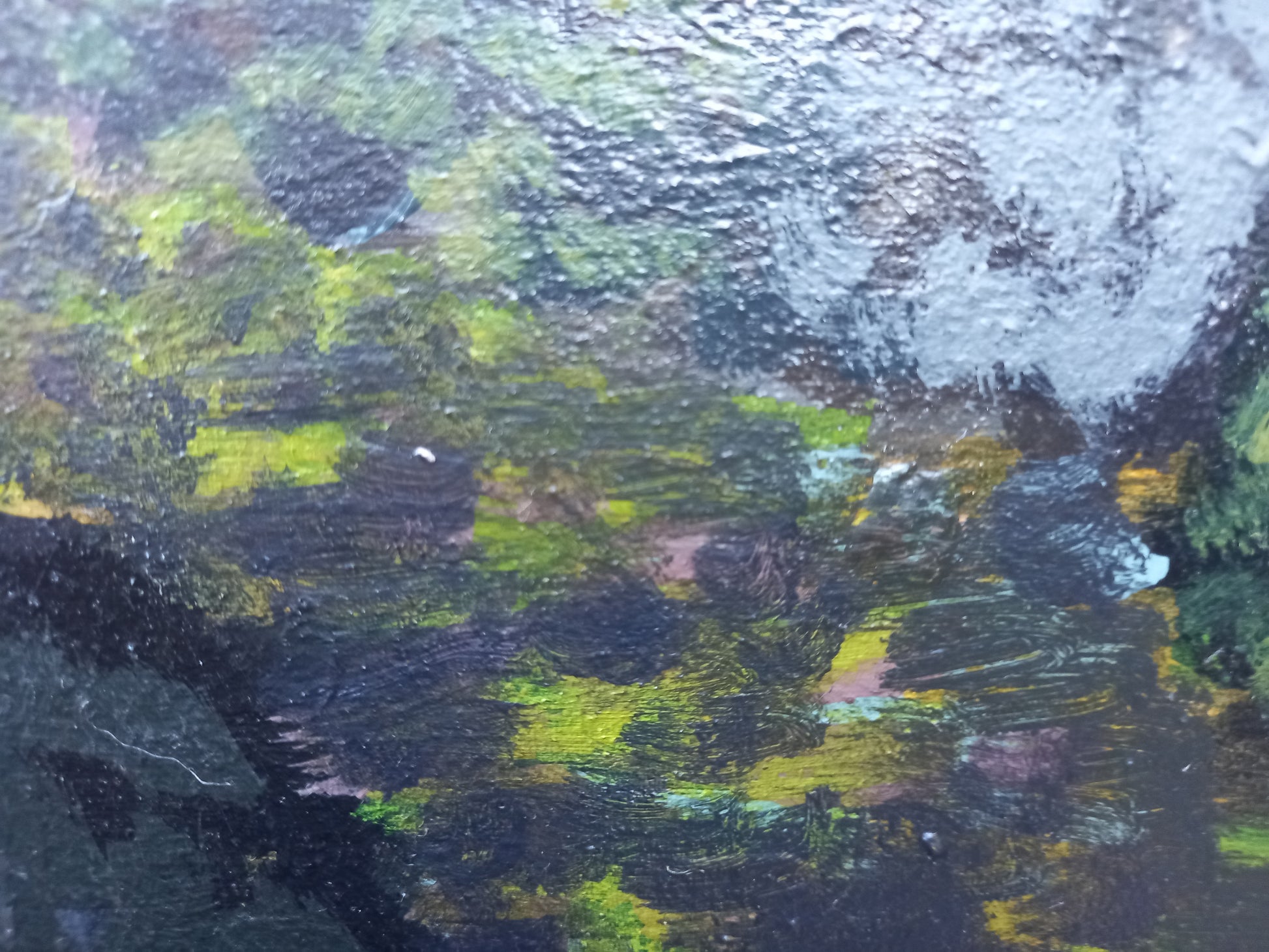 Acrylic on linen, with 20/30 coats scumble glaze, varnish painted in and over. Attention is drawn to the subtleties in light and depth achieved through these glazing techniques. This unique piece features subtle variations that enhance its charm and character.