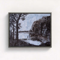 Echoes of Blue is a serene and atmospheric piece, bathed in soft blue tones. A tranquil lake stretches across the scene, framed by shadowy trees, while two delicate silhouettes, a mother and child, walk along its edge. Their forms, like distant memories, blend into the dreamlike composition, evoking themes of nostalgia, connection, and the quiet passage of time.