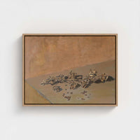 A contemplative still life, a dried poppy rests upon the table as scattered seeds suggest themes of memory, fragility, and renewal.