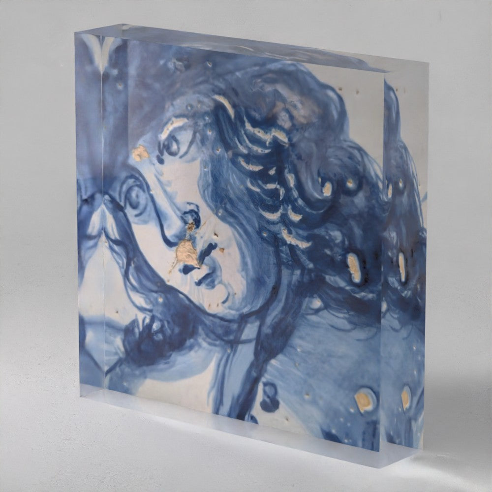 A photographic giclée print of a beautiful blue Portuguese azulejo, presented in an acrylic glass prism. This piece offers exceptional depth and a striking, three-dimensional freestanding display.