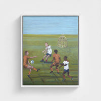When the Birdcage of Time,.... blends the ordinary with the symbolic. At first glance, a familiar scene unfolds, footballers absorbed in their game on a sprawling pitch. Yet in the background, a large golden birdcage stands with its door ajar, subtly suggesting escape. The contrast between the structured world of sport and the open cage evokes themes of freedom, time, and the fleeting nature of opportunity.