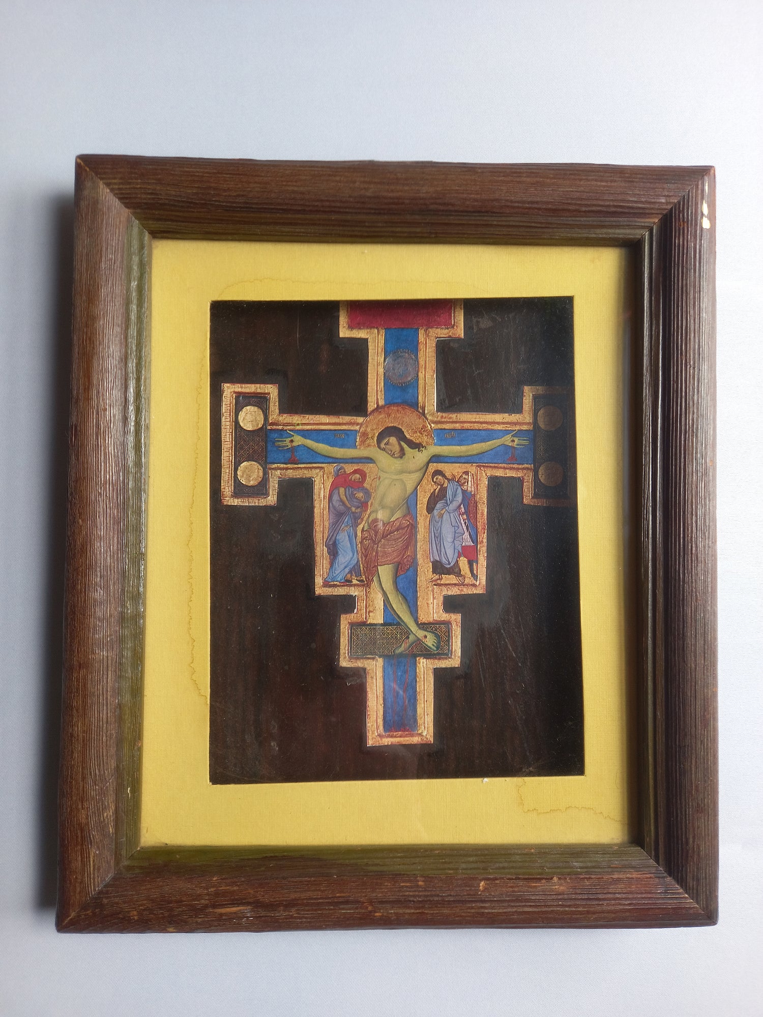 A rustic, handcrafted icon inspired by the original Crucifix icon (13th century, Master of Saint Francis, Italo-Byzantine). Presented in a wooden frame with glass glaze.