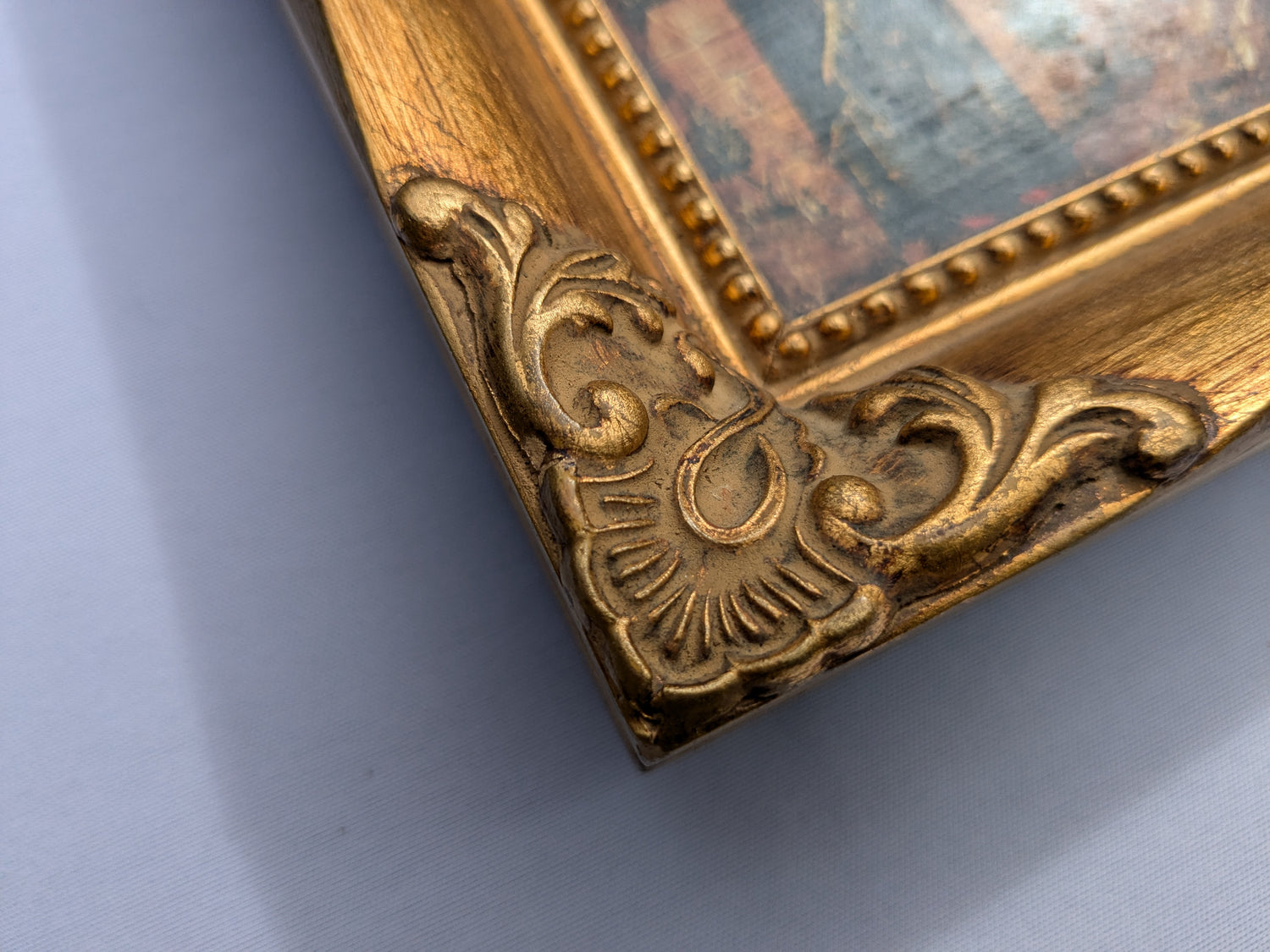 A rustic, handcrafted icon inspired by the original Crucifixion icon (14th century, Workshops of Constantinople, Byzantine). Presented with a gilt frame.