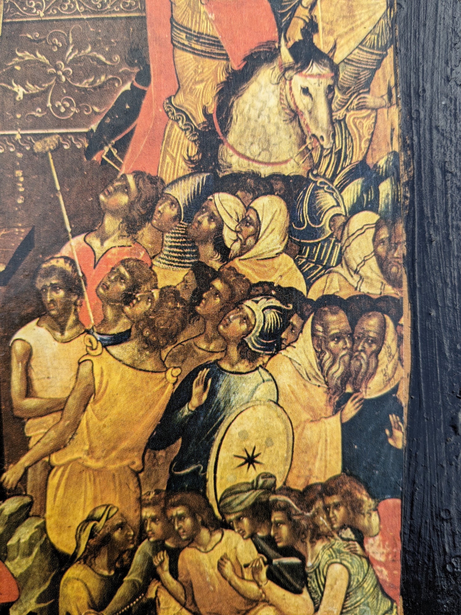 A rustic, handcrafted icon inspired by the original Crucifixion icon (mid 14th century, Paolo Veneziano, Byzantine).