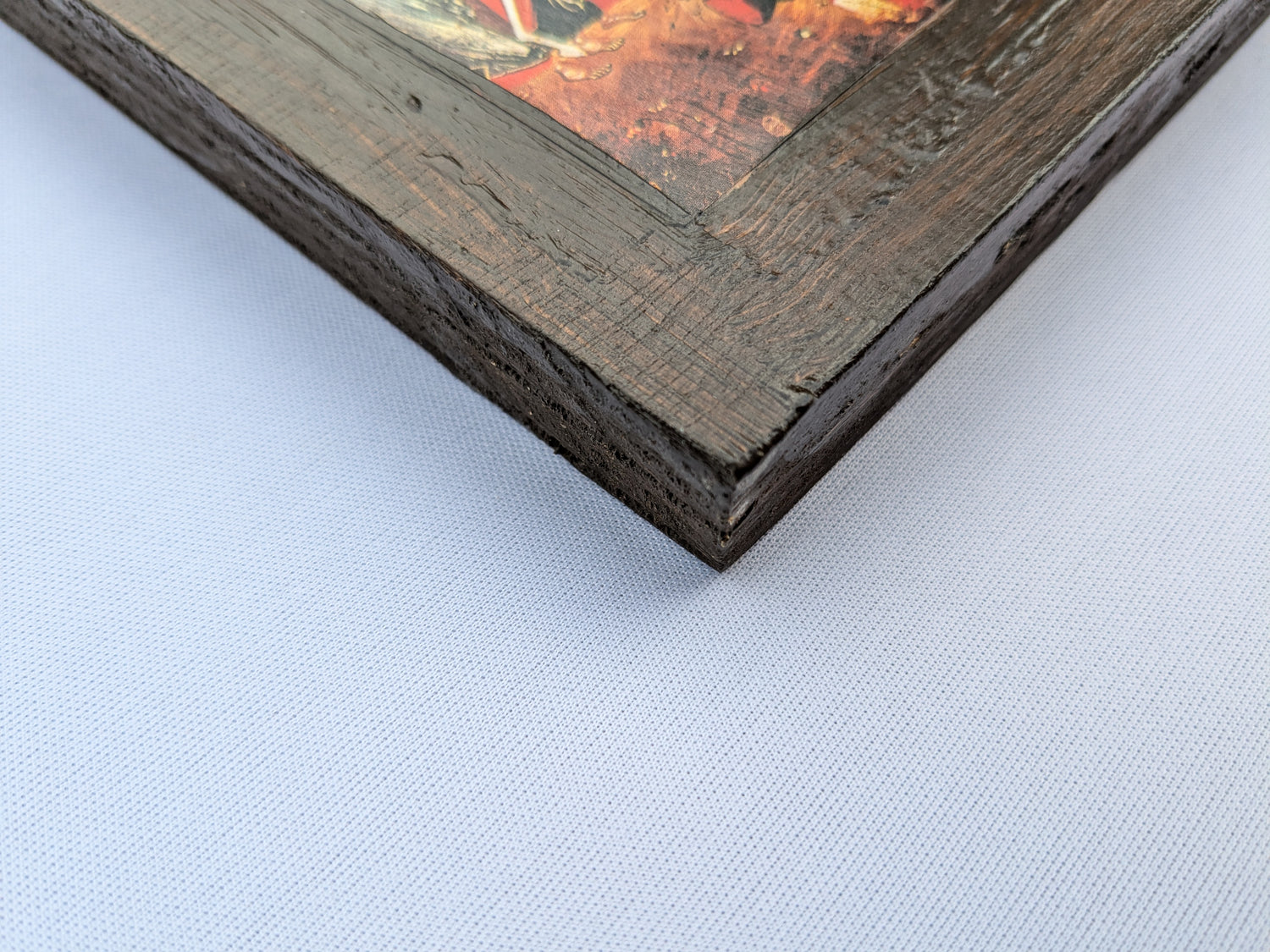 With Eikṓns, Robson focuses on the sacred, producing icons that reflect the profound depth and timelessness of Orthodox tradition. Each piece is meticulously handcrafted, beginning with a decoupage on reclaimed wood and layered with subtle washes of egg tempera, stainers, varnish, and water lacquer. Expertly distressed to evoke the gentle patina of aged sacred art, some icons are further enhanced by elegant gilt or natural wood frames, amplifying their devotional presence.