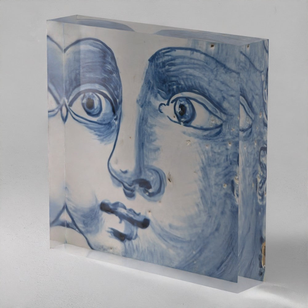 A photographic giclée print of a beautiful blue Portuguese azulejo, presented in an acrylic glass prism. This piece offers exceptional depth and a striking, three-dimensional freestanding display.