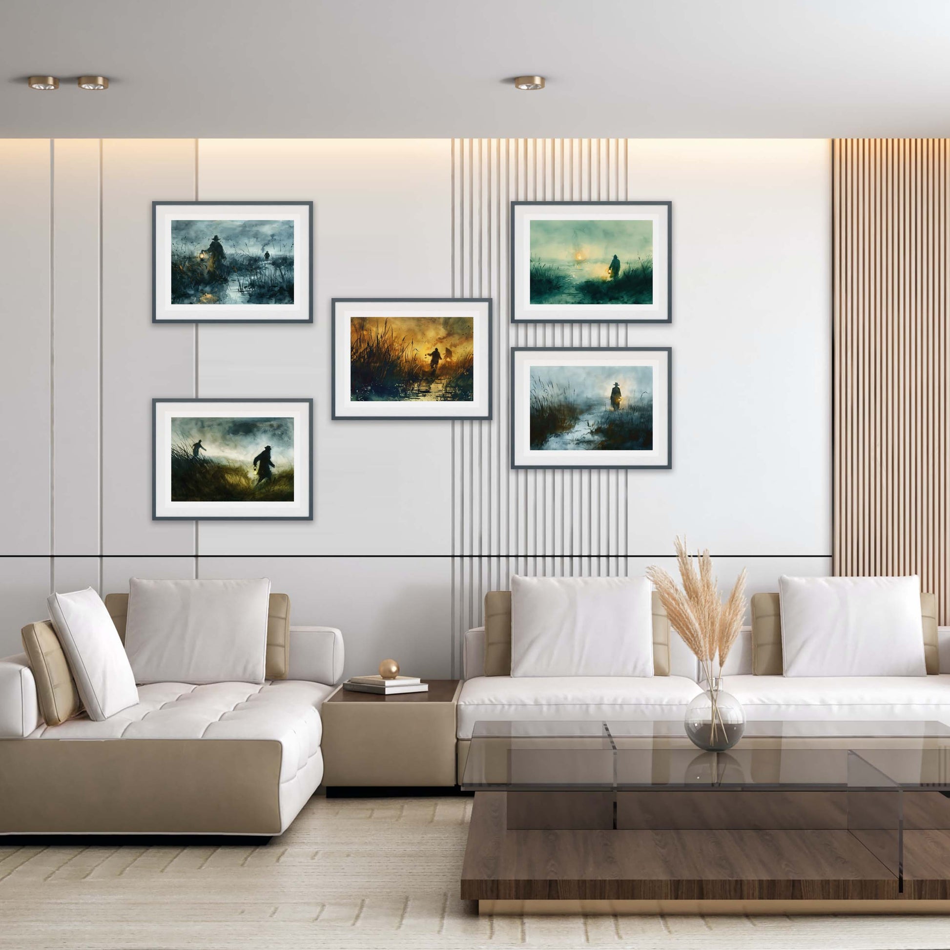 A framed set of five giclée fine art prints, hand-signed, limited edition artworks by Timothy Langton.