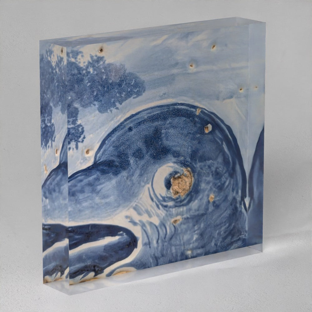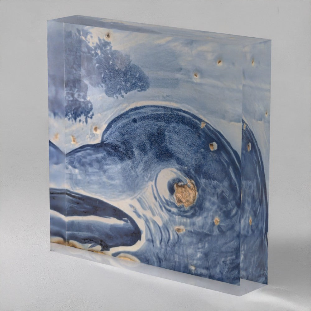 A photographic giclée print of a beautiful blue Portuguese azulejo, presented in an acrylic glass prism. This piece offers exceptional depth and a striking, three-dimensional freestanding display.