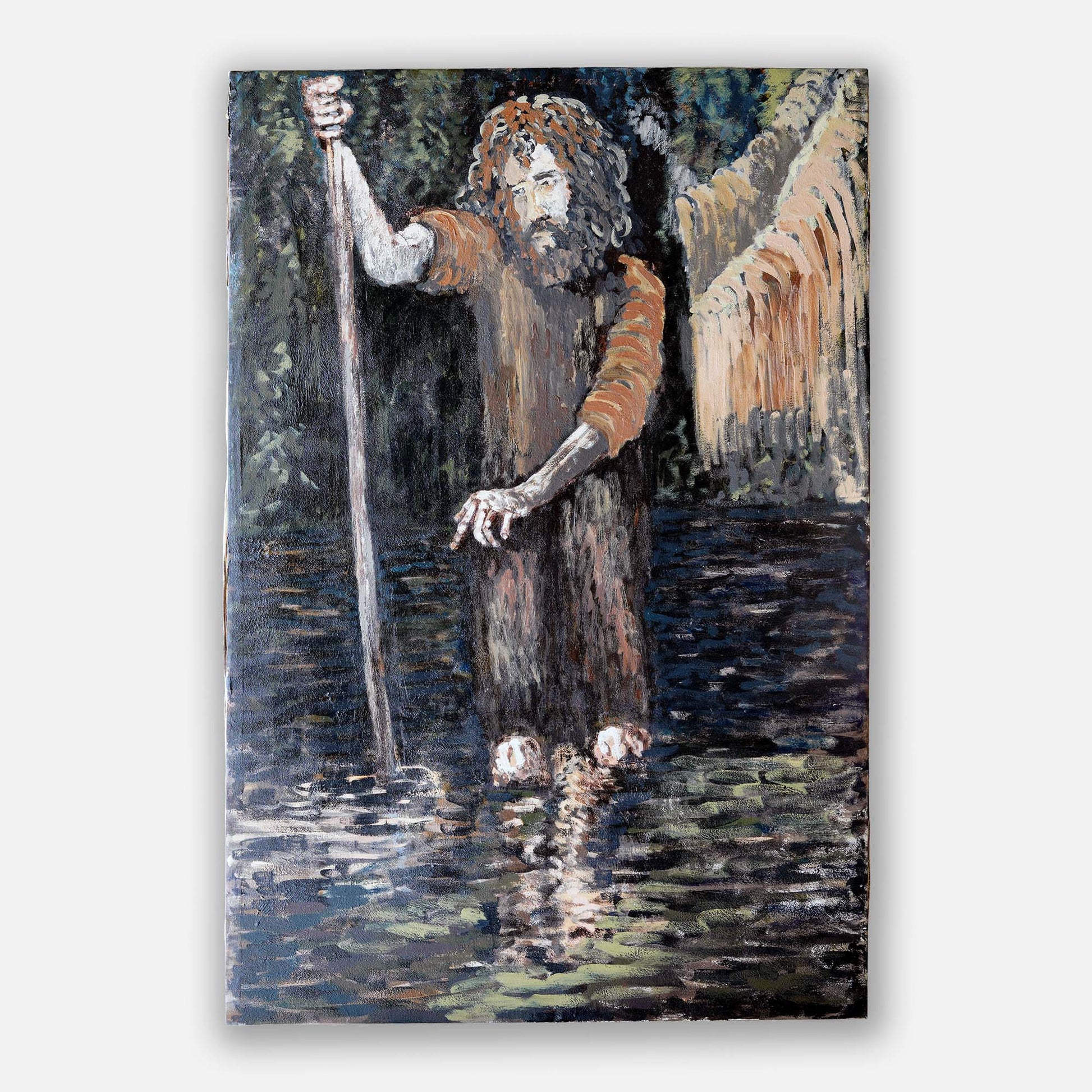 An epic, large-scale exercise in the refinement of artistic technique, Robson's artwork Paul Wading Through Water (2010), showcases both skillful craftsmanship and evocative imagery. The painting highlights the significance of water in the Apostle Paul’s life and teachings. Paul’s journeys often brought him into contact with water, symbolising both physical and spiritual trials. He survived shipwrecks, faced peril at sea, and crossed rivers during his missionary travels, reflecting his unwavering faith amidst adversity. Water also echoes the theme of baptism in his teachings, representing renewal and transformation through Christ.