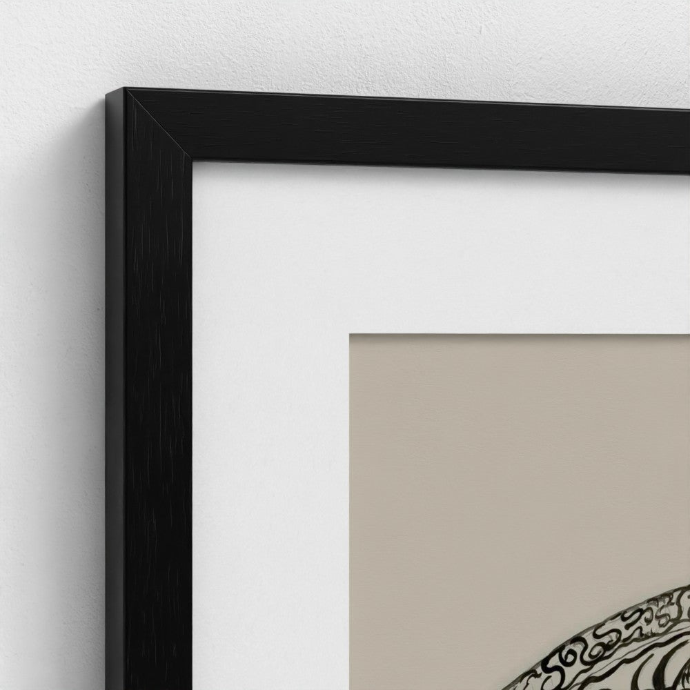 This giclée print on Hahnemühle German Etching 310gsm paper, is mounted in a black wood frame and finished with a UV-resistant Perspex cast acrylic glaze, ready to hang.