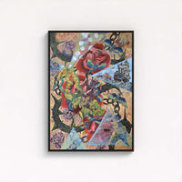 In the fascinating surreal piece Journey of the Dreamweaver, a young girl rides a super-saturated parakeet through a fantastical world, surrounded by symbols of fate and freedom, including dice, chains, roses, and vibrant hummingbirds. Mystical galleon ships and a spider are encased in glowing blue triangles, adding to the dreamlike atmosphere. "Journey of the Dreamweaver seeks to capture the ethereal, mind-expanding experience of hallucinogenic drugs" — Simon Lee Robson. It pairs beautifully with Stout and Ladders (2016), another standout from the artist’s collection.