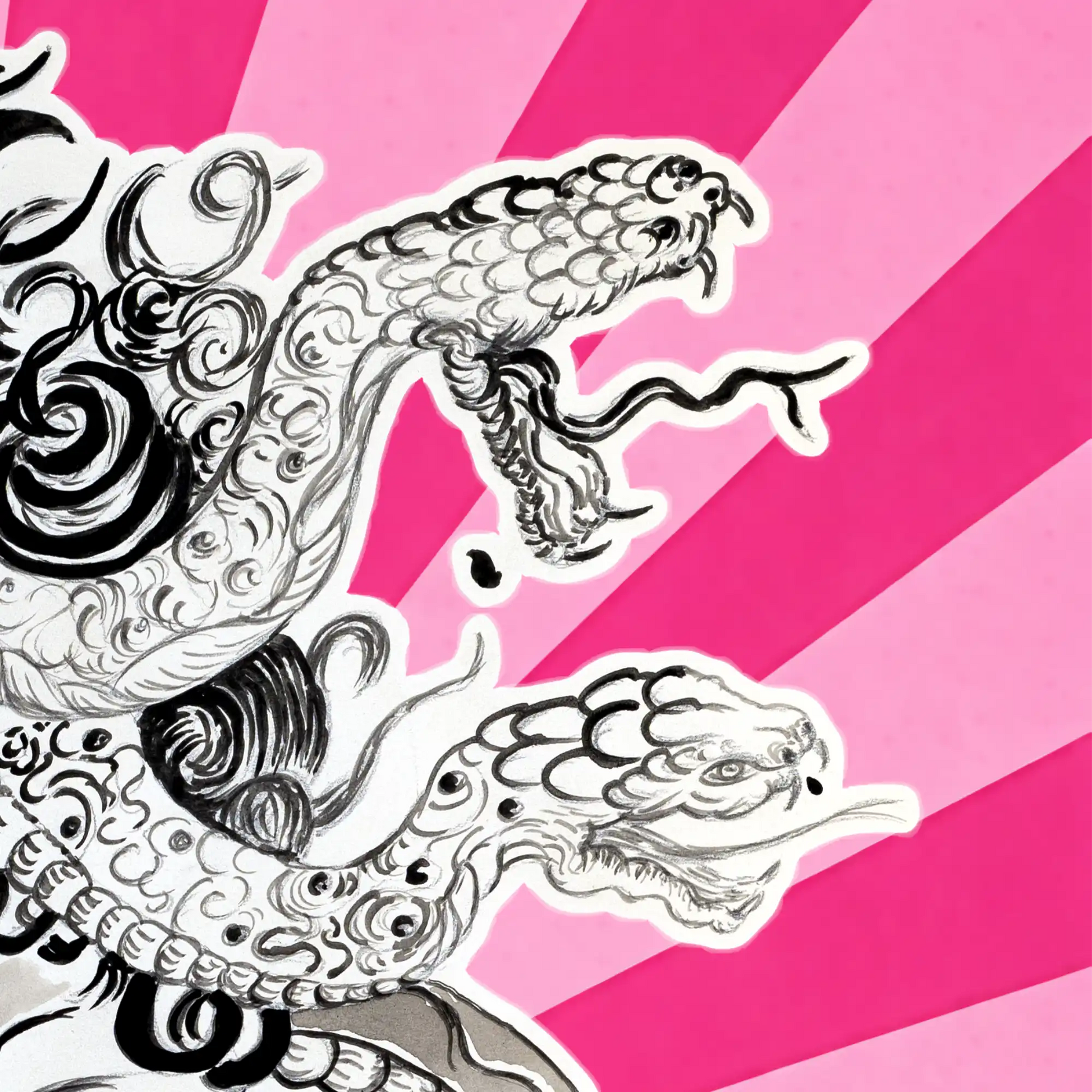 A stark reimagining of the Gorgon’s fall, serpents held in silent tension as Medusa’s gaze remains defiant and eternal. Rendered in monochrome, the composition is set against a radiant chromatic pink field that deepens the work, lending it a more contemplative, almost regal atmosphere while preserving the integrity of the central form.
