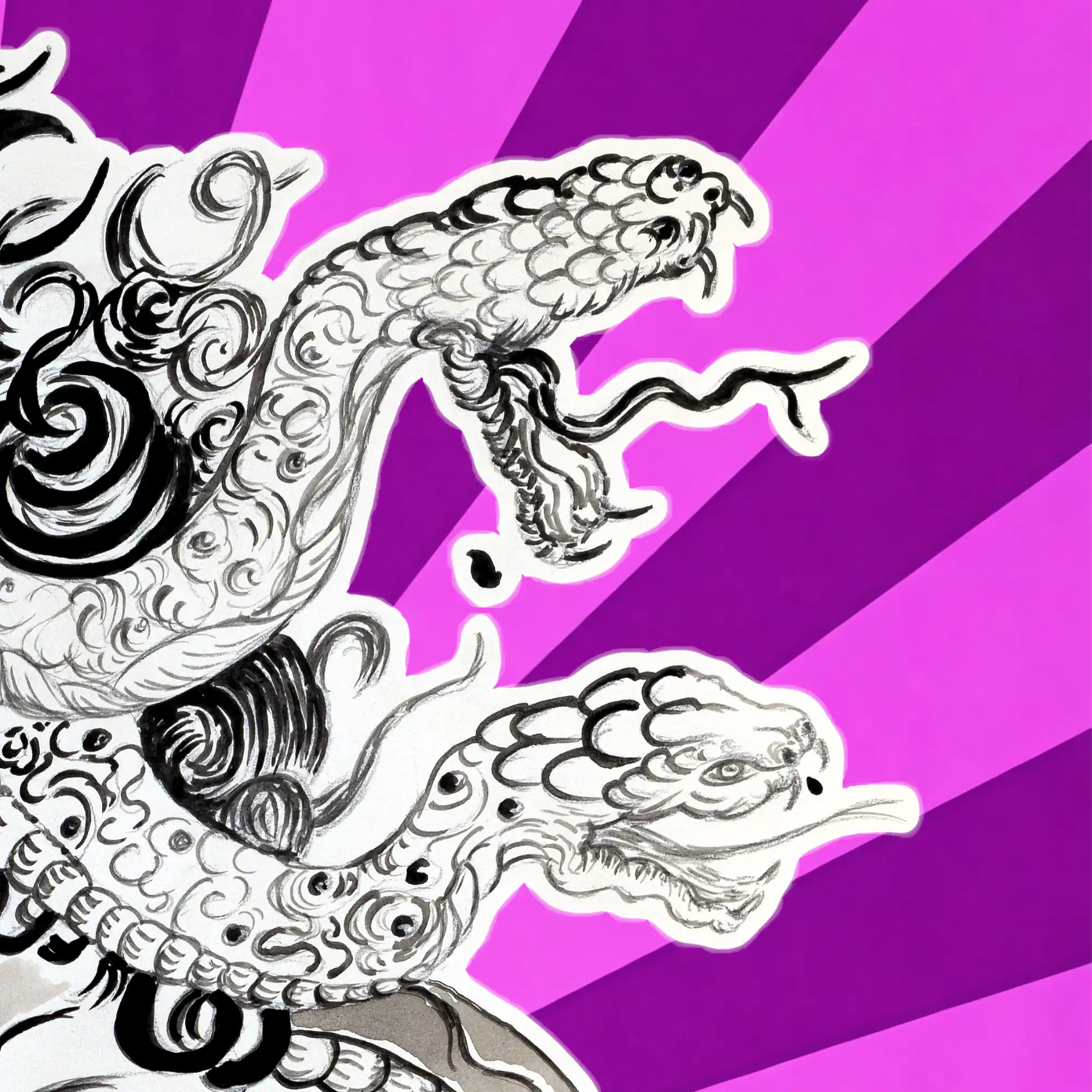 A stark reimagining of the Gorgon’s fall, serpents held in silent tension as Medusa’s gaze remains defiant and eternal. Rendered in monochrome, the composition is set against a radiant chromatic purple field that deepens the work, lending it a more contemplative, almost regal atmosphere while preserving the integrity of the central form.