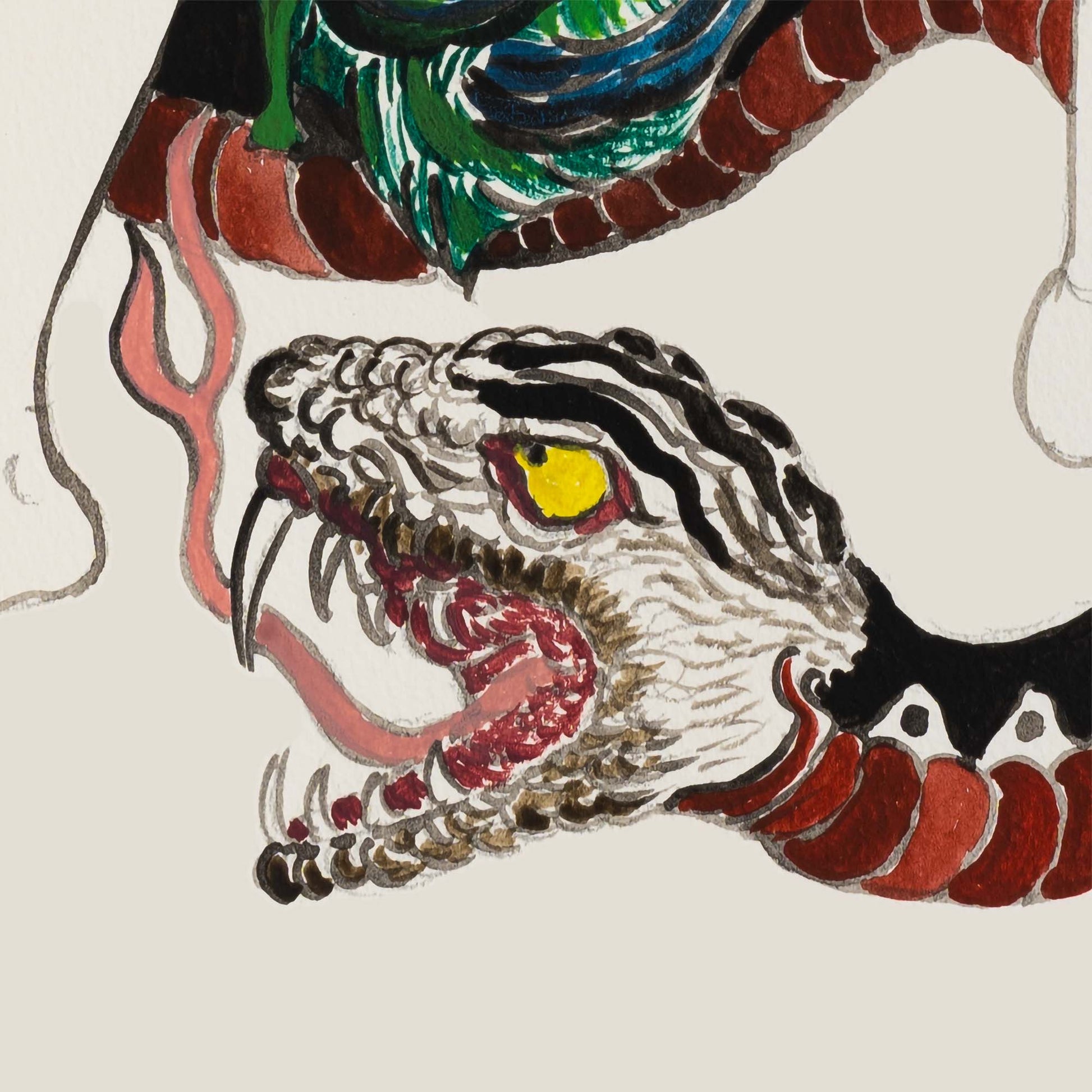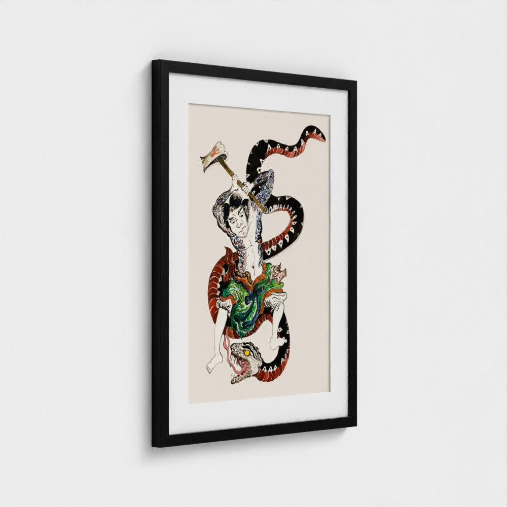 A reimagined study based on Horihide’s tattoo series, depicting a warrior in battle with a serpent.