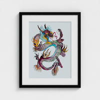 Inspired by a Japanese tattoo design, this giclée print on Hahnemühle 308gsm paper, is mounted in a black wood frame and finished with a UV-resistant Perspex cast acrylic glaze, ready to hang.