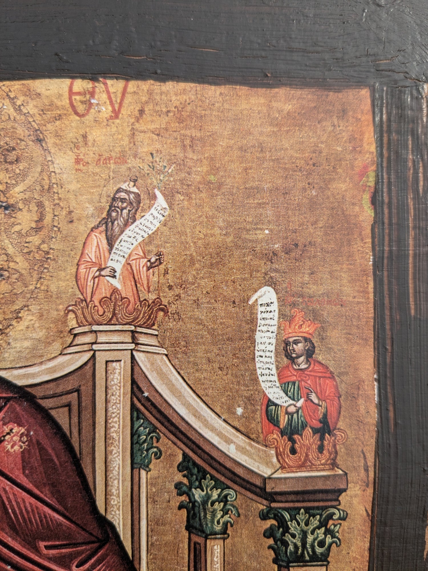 A rustic, handcrafted icon inspired by the original The Virgin Brephokratousa Enthroned icon (17th century, Emmanuel Tzanes, Cretan School).