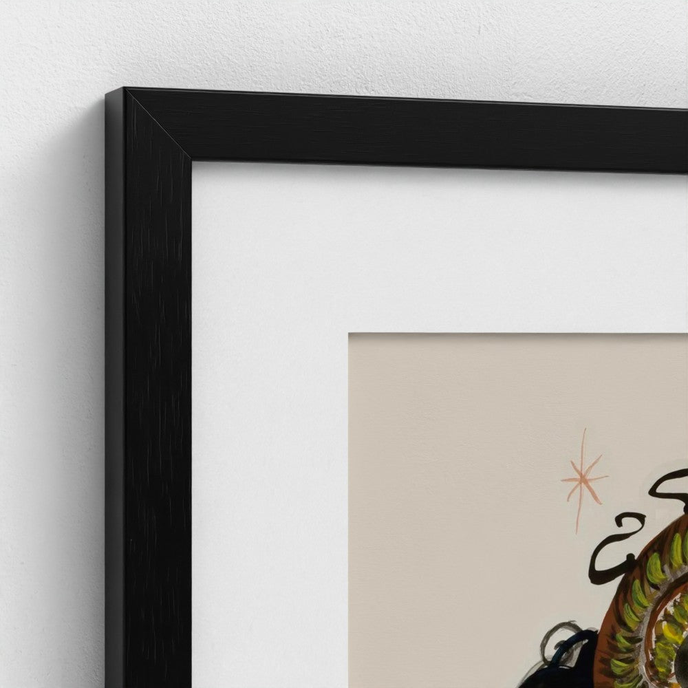 This giclée print on Hahnemühle German Etching 310gsm paper, is mounted in a black wood frame and finished with a UV-resistant Perspex cast acrylic glaze, ready to hang.